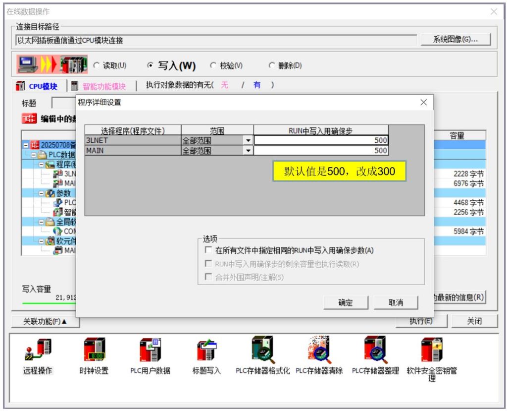 发生这个问题的原因是设备程序本来的容量已经接近极限,后期设备维护人员又用RUN中写入的方式写了很多程序,导致设备程序的容量加上默认的500步RUN中写入用确保步后就会超出PLC容量极限。