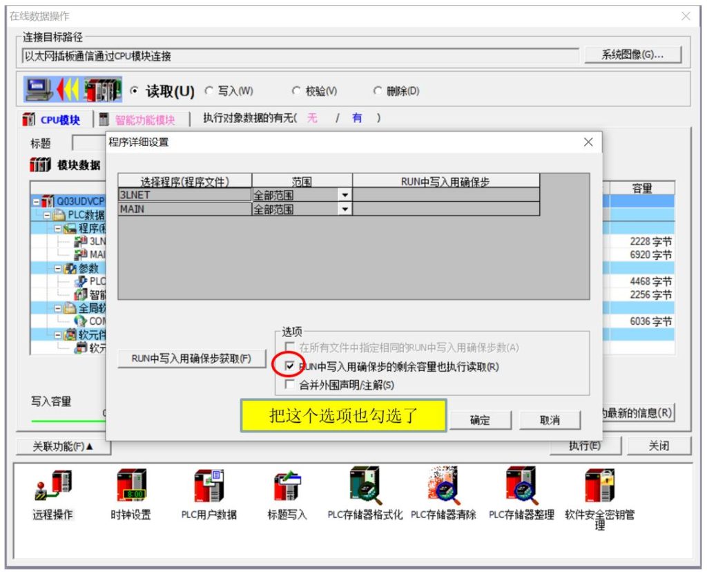 我的设备有使用三菱Q系列的PLC,有一次故障,怀疑是PLC程序有问题,想把程序备份下来,写入一台相同型号的PLC,来判断问题。使用三菱的works 2软件备份程序的软元件数据正常。但是再将程序上传到新PLC上的时候却提示空间不足。很奇怪,明明是相同型号的PLC,怎么可能空间不足呢?